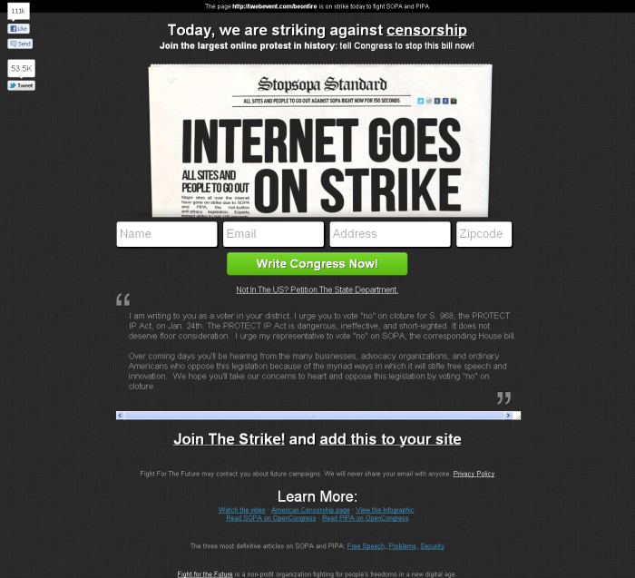 UPDATE: I accidentally bumped into a setting on my blog dashboard offering to send my site dark or add a ribbon of protest. Talk about organized! This blog is on the wordpress.com platform. A setting like this makes it extremely simple for hundreds of thousands of bloggers to black out today. Like I said above — fascinating….